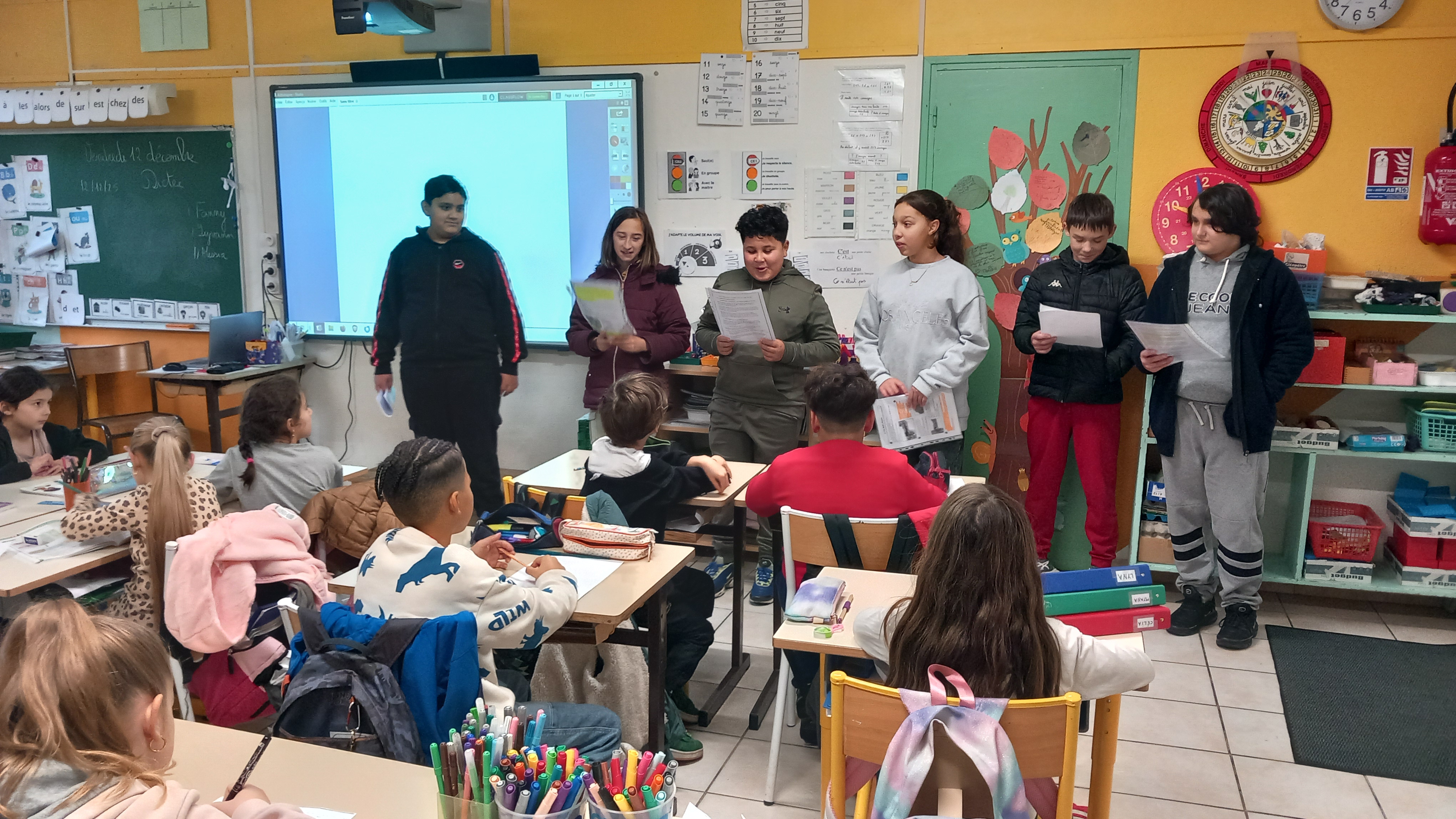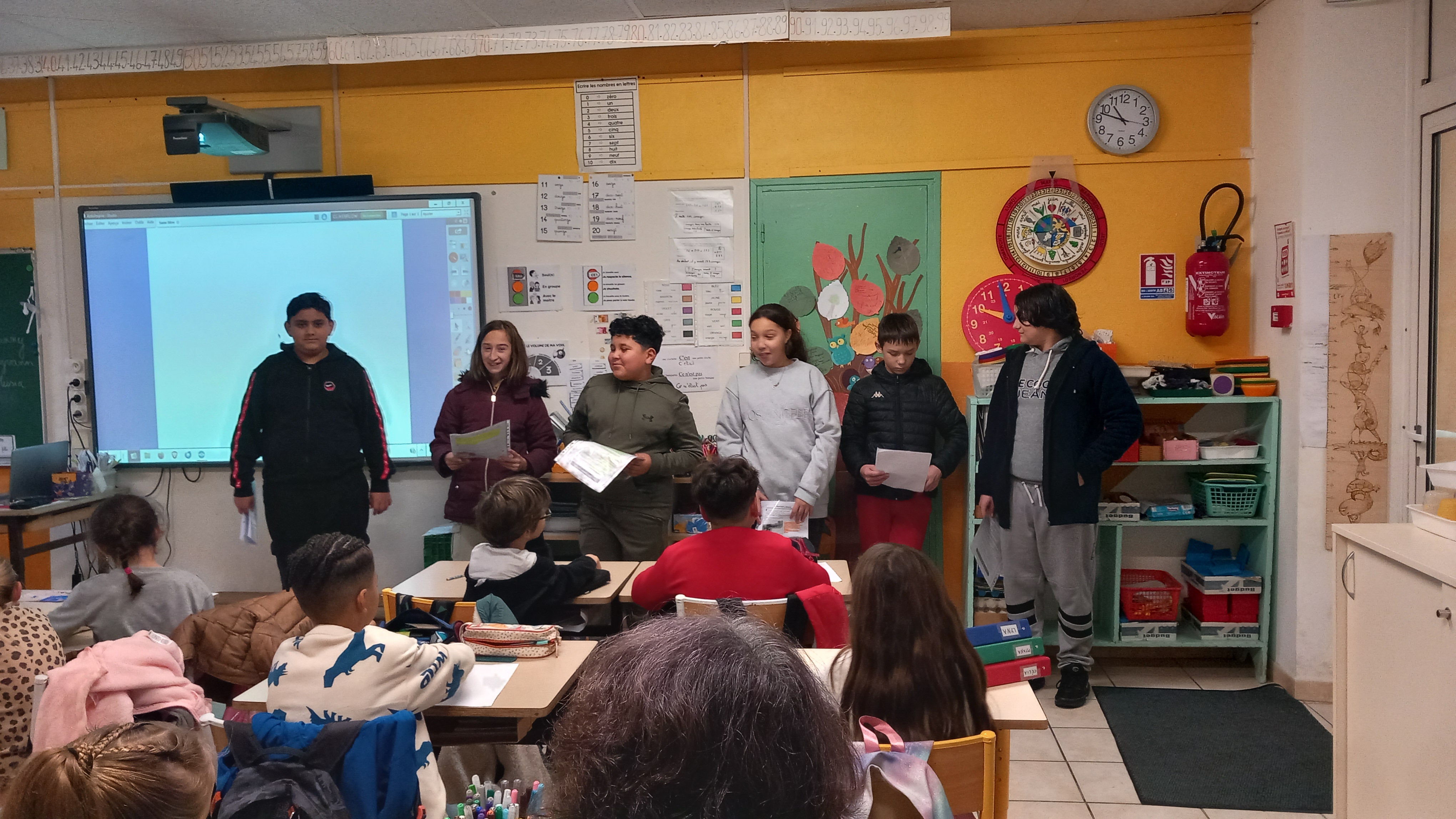 Dans le cadre de l 'enseignement de la lecture et de la liaison cycle 3 avec l'école du Martinet , la classe de 6° s'est rendue à l'école afin de partager son travail de mise en voix et en jeu d'un extrait de Marcel Aymé Les contes rouges du Chat Perché (extrait de 15 lignes, dialogue entre Delphine et le Loup). Ce travail fait suite à une séquence sur l'étude du conte Le Petit Chaperon rouge de C.Perrault et d'un petit corpus sur les variations de ce conte.